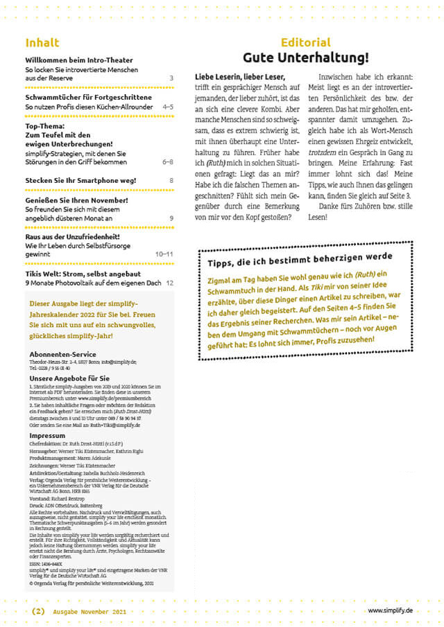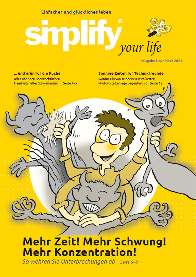 "simplify your life" erscheint jeden Monat im bequemen Abonnement. Zusätzlich veröffentlichen wir jährlich 6 exklusive Themenschwerpunkte. Noch einmal: Das Abonnement können Sie jederzeit kündigen. Und zwar ohne Angabe von Gründen.